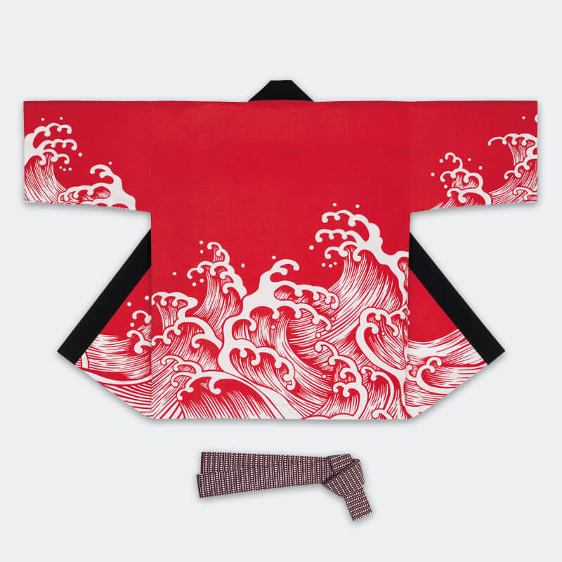大人袢天【活印】シルクプリント袢天 波柄・赤