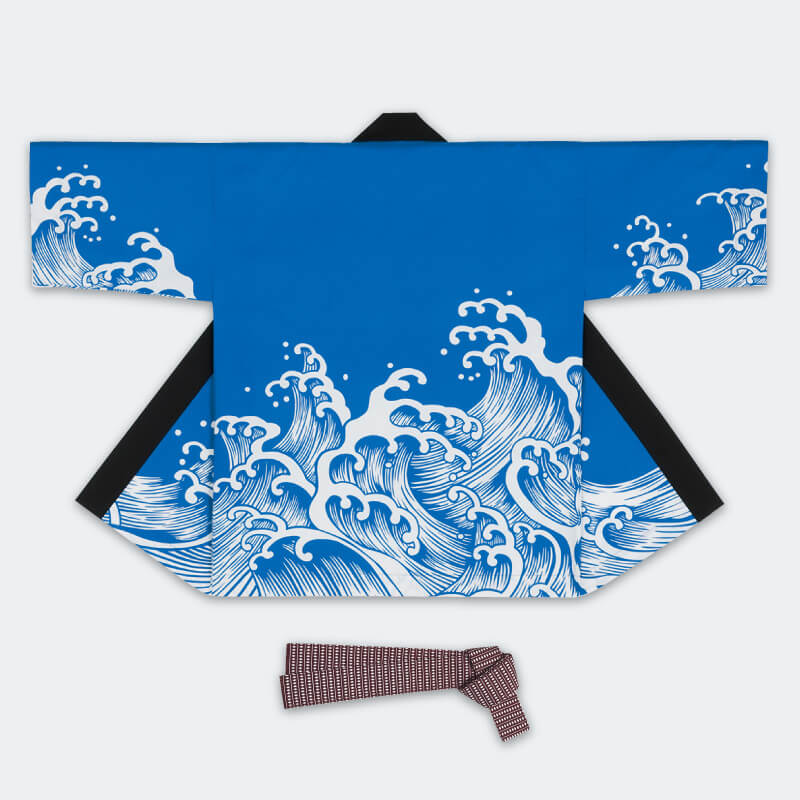 大人袢天【活印】シルクプリント袢天 波柄・青